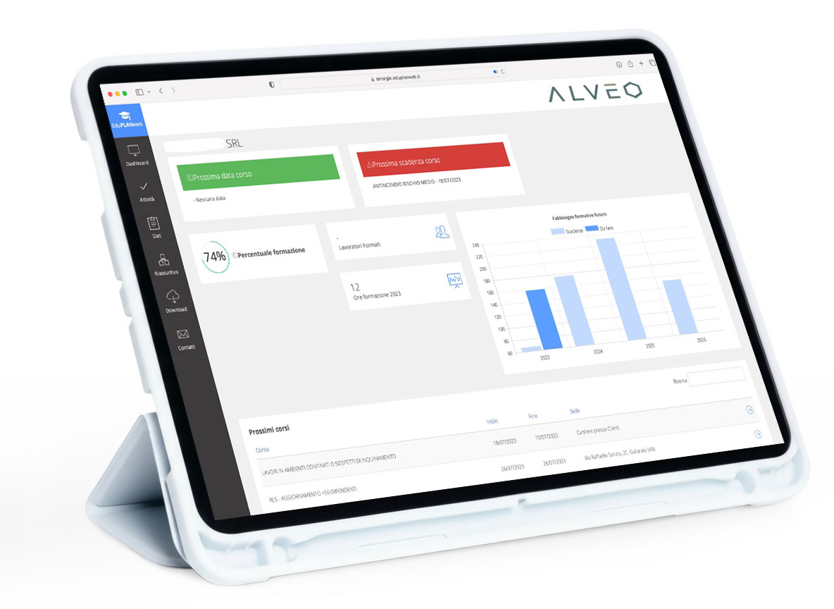 Con Alveo hai una visione completa e aggiornata della tua azienda: scadenze, formazione, documenti, attestati, ruoli e responsabilità sono organizzati in un unico ambiente digitale, accessibile e strutturato.